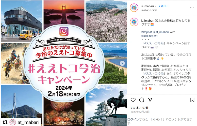 内容と結果:今治市の特産品であるタオルの魅力を発信するため、指定のハッシュタグ「#ええトコ今治」を付けて写真を投稿すると、抽選で高級今治タオルセットが当たるキャンペーンを実施。この結果、400件以上の投稿が集まりました。