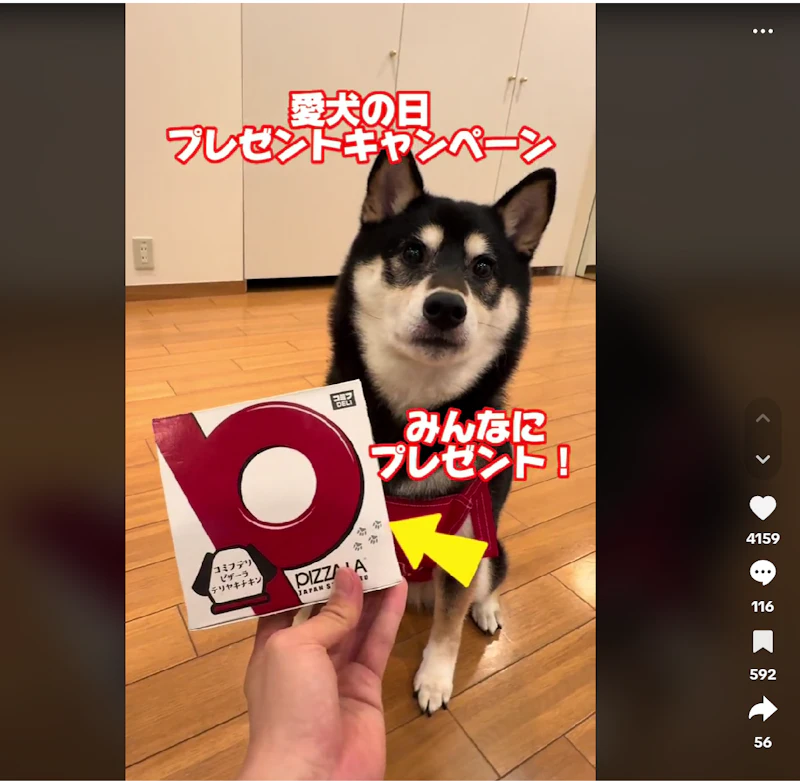 - 内容と結果: 「愛犬も一緒に楽しく食べられる」商品を作っているコミフデリとのコラボ商品である、犬用ピザをプレゼントするキャンペーンを実施。応募条件は、アカウントのフォロー、投稿へのいいね、愛犬の名前をつけてコメント。これにより、商品の認知拡大を図り、参加者の関心を引きつけました。