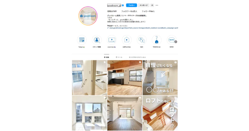 グッドルームは、賃貸の不動産会社で、Instagramのフォロワー数15万人以上の人気アカウントです。