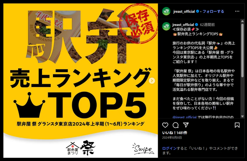 フォロワーは約9.9万人を超え、「駅弁売上ランキングTOP5」など、旅にまつわるコンテンツをスライド形式でテンポよく投稿しています。