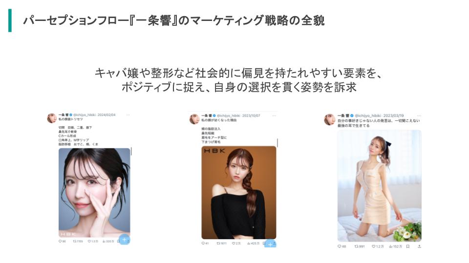 一条響さんの成功の要因の1つに、自己プロデュース力の高さがあります。彼女は歌舞伎町No.1キャバ嬢という実績を活かし、まつげ美容液やサプリ、美容エステサロンといった商品を展開。これらは彼女の美容意識と努力を象徴する製品として認知されています。特にSNSでは、努力家としての姿勢や自己成長への追求がポジティブに発信され、ファンに勇気と共感を与えています。一条響さんのブランディング戦略は、社会的偏見を逆手に取り、「整形」や「キャバ嬢」というテーマを自己プロデュースに活かしている点が特徴的です。自分が思う理想像に対して努力し続ける姿が、「自分も努力すれば美しくなれる」という肯定感を得たいユーザーを惹きつけていると言えます。