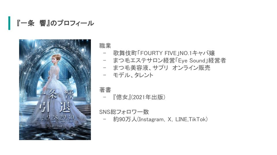 一条響さんの経歴は、キャバ嬢としての成功に始まります。彼女は歌舞伎町「FOURTY FIVE」でNo.1キャバ嬢として活躍し、その後、美容事業にも進出しました。自身のブランド「Eye Sound」を展開し、まつげ美容液やインナーケアサプリを販売。さらに、モデルやタレントとしても活動しています。2021年には、自身の経験を綴った著書『億女』を出版し、業界を超えた影響力を発揮。SNSの総フォロワーは約90万人となっています。一条響さんの経歴は、キャバ嬢としての知名度を自己ブランディングに活用した成功例と言えるでしょう。