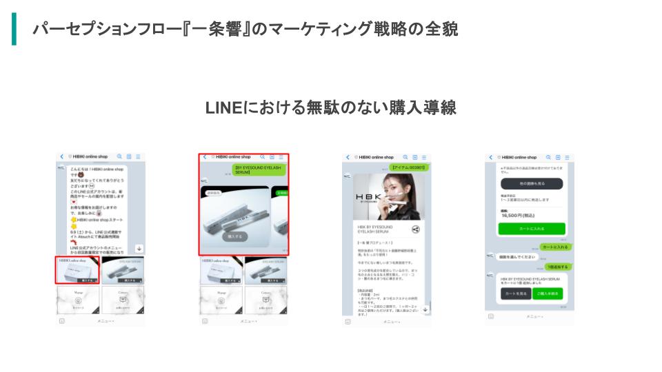 一条響さんのプロデュースする商品は、LINEを活用した購入フローが特に優れており、リッチメニューからオンラインショップを直接開ける設計で、LINE上で購入が完結します。一般的なオンラインショップのようにサイトを跨ぐような複数の操作を必要とせず、「数クリックで購入可能」という高いユーザビリティが特徴です。このシンプルな導線設計は、ネットショップの美観にコストをかけるよりも効果的で、「興味関心」段階で築いた『一条響』という人柄やブランドへの信頼が再購入を後押ししています。