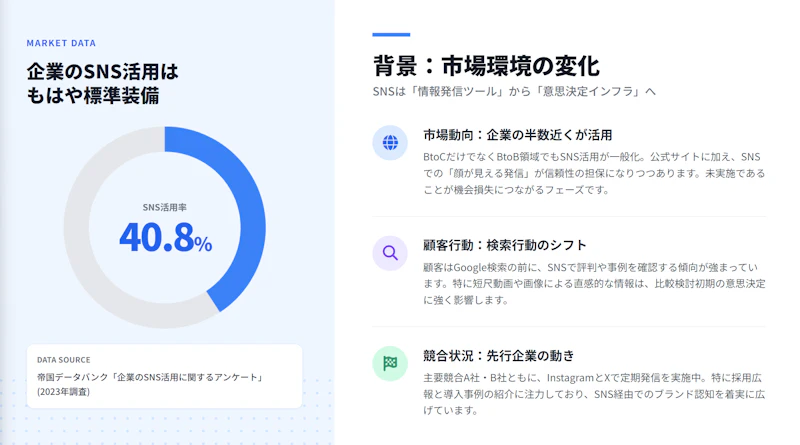 SNSを取り巻く市場環境を簡潔に示します。帝国データバンクの2023年調査によると、企業の40.8%がSNSを活用しています(参照:https://www.tdb.co.jp/report/economic/xhldw9cakj/ )。こうしたデータを使って「業界全体の流れ」を見せましょう。