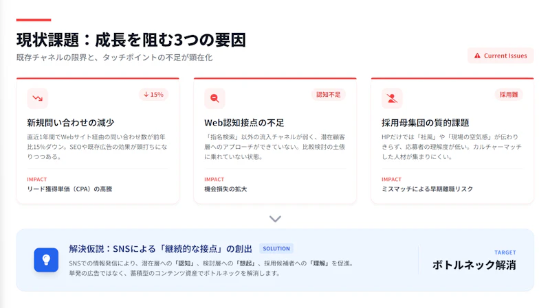 自社が抱える課題をSNSと接続して提示します。認知不足、リード獲得の伸び悩み、採用母集団の不足など、決裁者が実感している課題と紐づけることが大切です。 記載例:「直近1年で新規問い合わせ数が15%減少。Web経由の認知接点が不足しており、SNSでの情報発信が有効と考えます。」