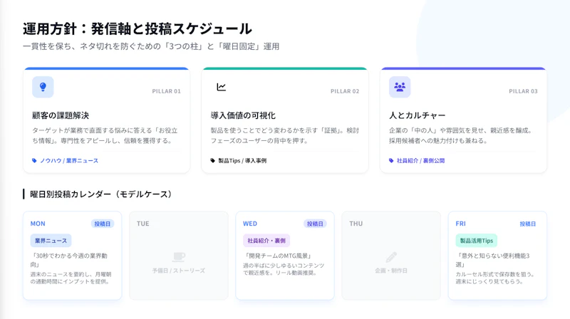 何を発信するかの軸を決めます。曜日ごとにカテゴリを固定すると、ネタ切れを防ぎやすくなります。 記載例:「月曜=業界ニュース、水曜=社員紹介、金曜=製品活用Tips」
