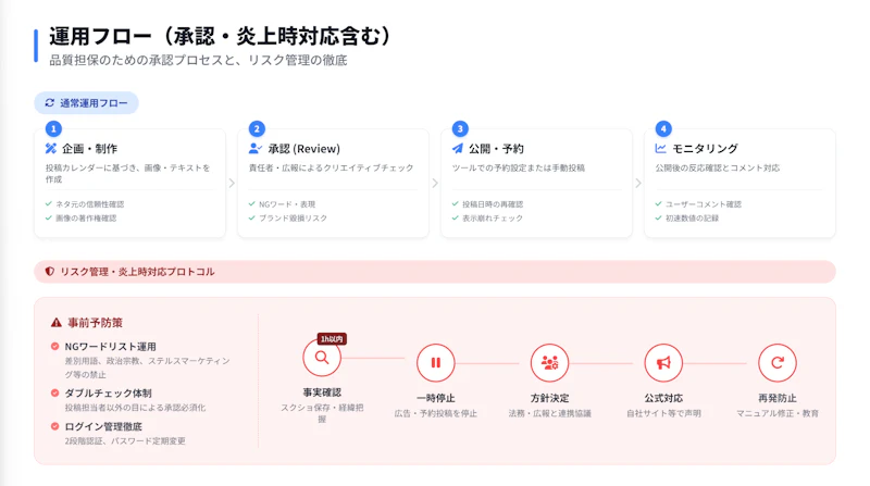 投稿の企画から公開までの流れと、万が一のトラブル時の対応手順を示します。ガバナンス面を最初から設計しておくと、決裁者の不安を先回りして解消できます。