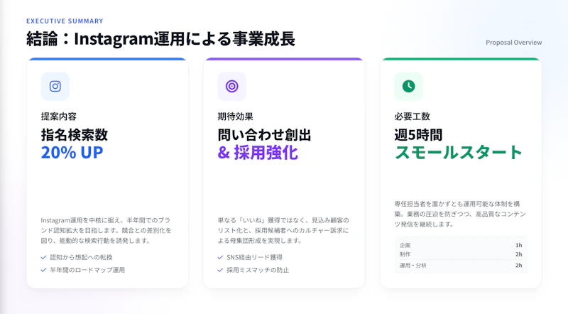 最初に「何を提案するのか」「期待できる効果」「必要な工数」を1枚にまとめます。忙しい決裁者は冒頭で全体像を把握したいので、ここで結論を示しておくのがポイントです。 記載例:「Instagram運用により、半年で指名検索数20%増を目指します。週5時間の運用工数で開始可能です。」