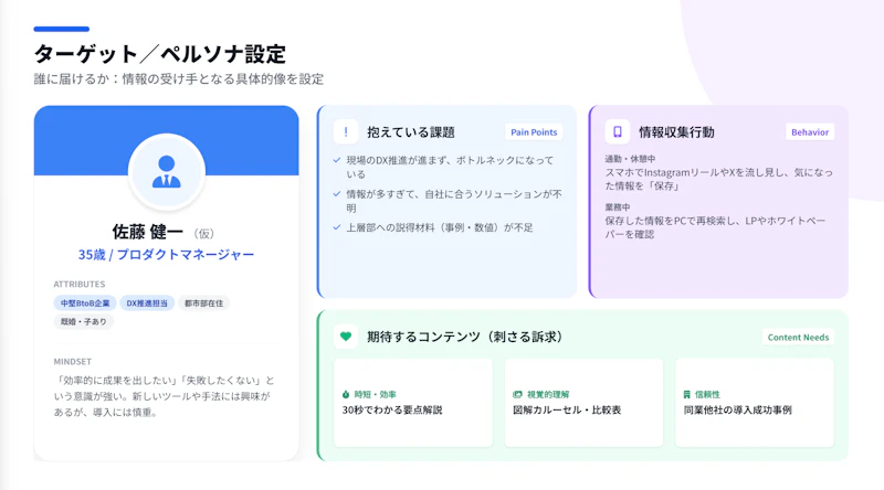 誰に届けるかを明確にします。年齢・役職・課題・情報収集の行動パターンまで具体的に設定すると、投稿内容の方向性が定まります。