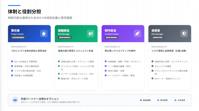 誰が何を担当するかを明示します。責任者・投稿担当・制作担当・承認者の4つの役割を最低限決めておきましょう。