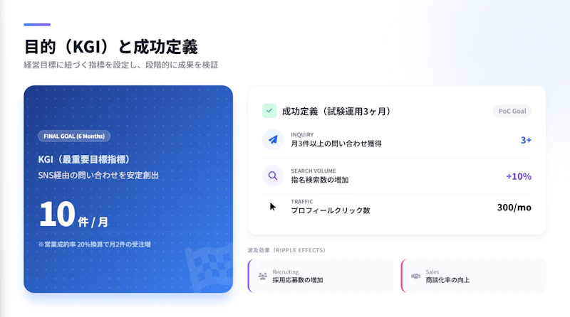 このステップの成果は、スライド4(目的・KGI)とスライド11(KPI設計と測定方法)に反映されます。
